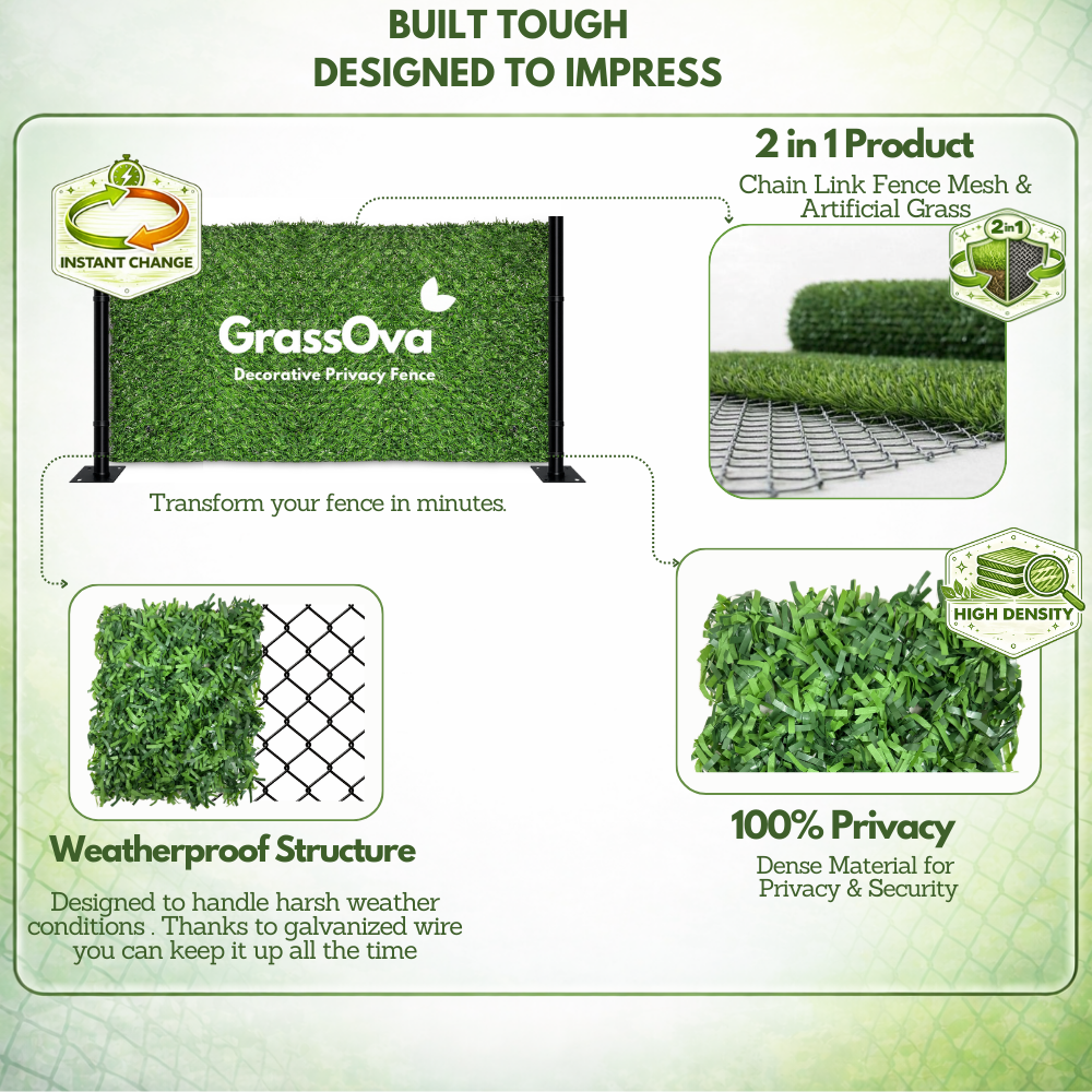 Unlike loose artificial grass rolls or surface-mounted privacy screens, Grassova is a true 2-in-1 fencing system. Each unit combines a reinforced chain-link wire structure with securely attached premium artificial grass, creating a rigid, wind-resistant fence that maintains its shape over time.